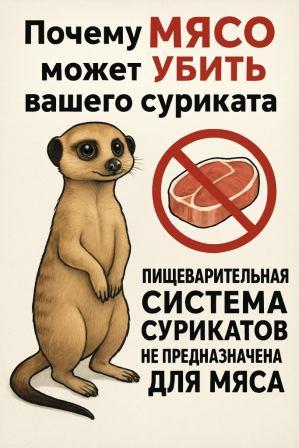 В статье объясним, почему кормление сурикатов мясом — опасная ошибка, приводящая к хроническим болезням и ранней смерти. Насекомоядная физиология зверьков требует рациона, который на 80% должен состоять из насекомых, тогда как мясо плохо усваивается, вызывает дисбаланс кальция и фосфора, перегружает внутренние органы и повышает холестерин.