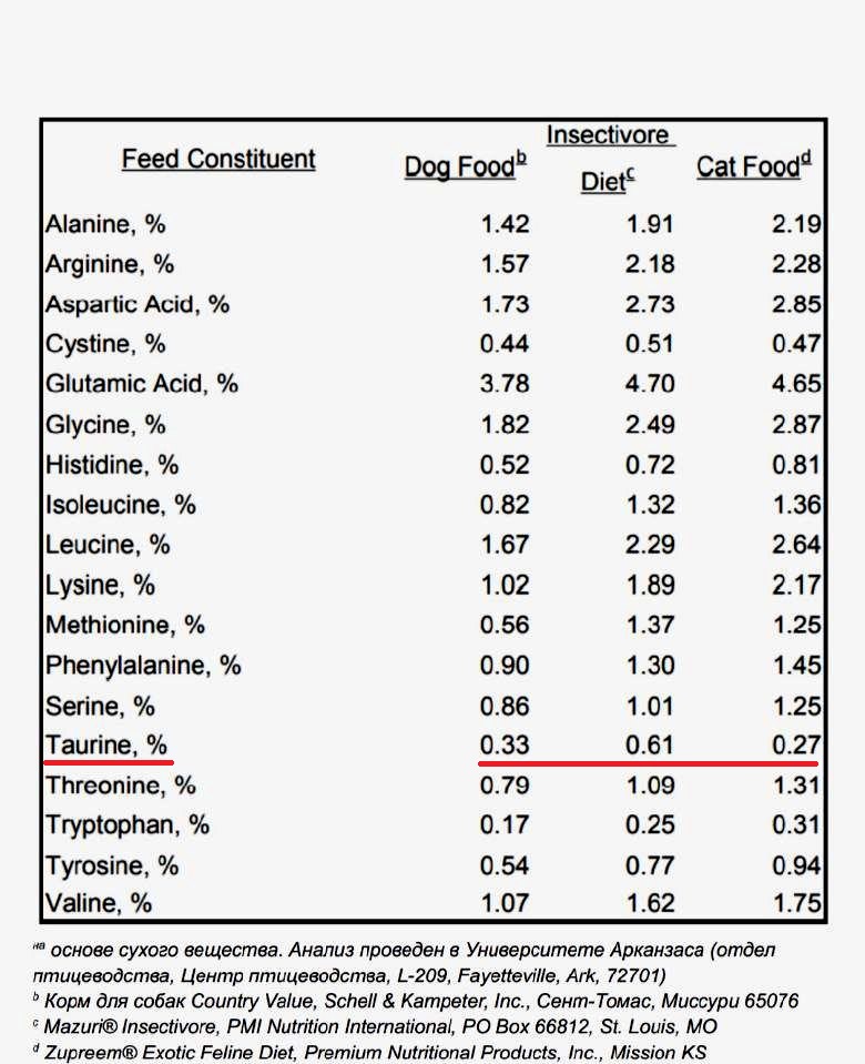 Таким образом, рацион с достаточным содержанием таурина может быть подходящей альтернативой привычным кошачьим/собачьим кормам, а анализ крови помогает понять, хватает ли животному этого вещества.