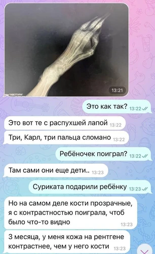 👉 склонность к переломам (на скринах ниже - сурикат с дефицитом сначала сломал себе пальцы, а потом шею);