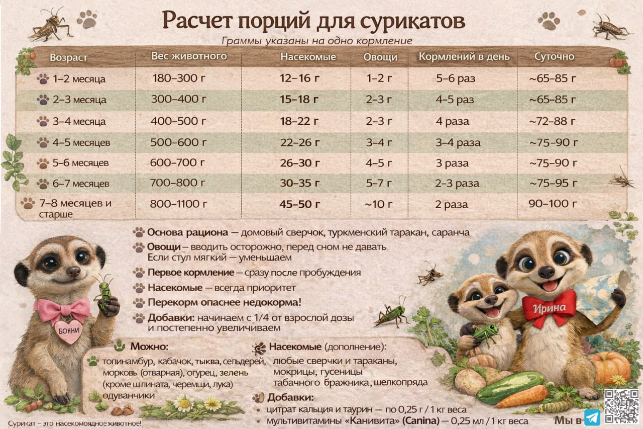 ОСНОВНЫЕ РЕКОМЕНДАЦИИ 👉 Разовая порция для совсем крох примерно 6–8% от массы тела. Порция и количество кормлений зависят от веса и возраста. 👉 С возрастом уменьшается количество кормлений и увеличивается разовая порция. 👉 К 7-8 месяцам плавно переходим на рацион взрослого суриката. 👉 Первое кормление — сразу после пробуждения, последнее — перед сном. 👉 Основа рациона — насекомые (сверчки, туркменский таракан, саранча). Овощи — дополнение, вводятся осторожно. Подробнее, что можно, в нашей инфографике и в статье про рацион 👆. 👉 Не давайте своим сурикатам личинки зофобаса, мучника и черной львинки даже в виде лакомства! Они содержат слишком много жира❗️ 👉 Овощи мелко режем. Не давать перед сном! Начинать с 1–2 г за кормление. Суточная норма — не более 10–15% от общего объёма пищи. 👉 Следим за стулом — он главный индикатор правильной порции. Если стул мягкий — уменьшаем овощи. Насекомые — всегда приоритет. 👉 Добавки: начинаем с 1/4 от взрослой дозы в сутки и постепенно увеличиваем. Либо в одно кормление, либо разделить. 👉 Перекорм опаснее недокорма!