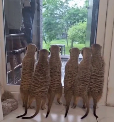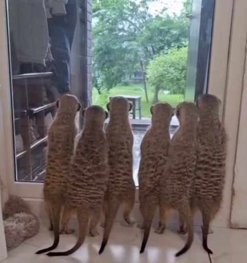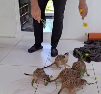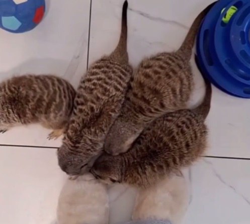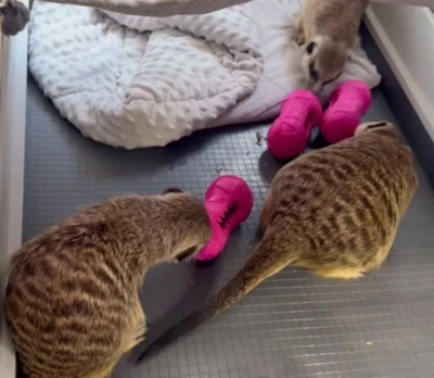 На фото сурикаты из приюта в городе Екатеринбург изучают новые тапочки хозяйки