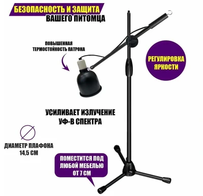 Мощность лампы (от 100 до 150 Вт) подбирают по расстоянию, на котором она будет находится — очень важно, что бы питомец не обжёгся (используйте термометр). Плафон должен быть рассчитан на соответствующую нагрузку, иначе оплавится.