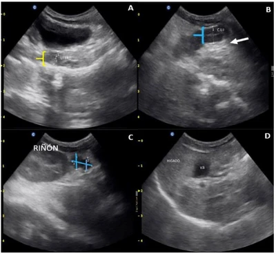 Ультразвуковые находки у самки суриката перед операцией (отечная матка, левый яичник с кистами, повышенная эхогенность печени)